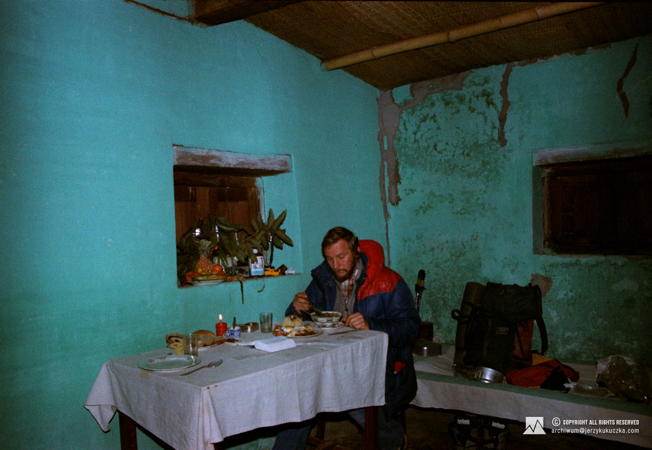 Jerzy Kukuczka w trakcie samotnej wigilii w drodze do bazy pod Dhaulagiri.