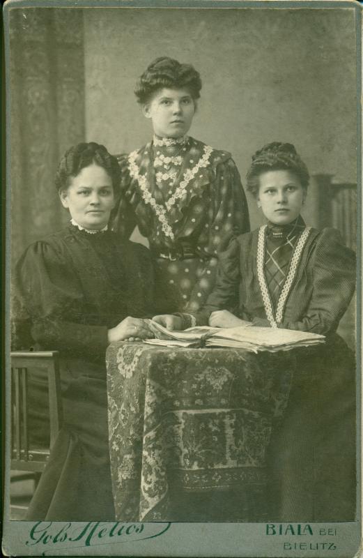 Portret trzech kobiet wykonany między 1901 a 1904 rokiem w Atelier "Helios" w Bielitz (obecnie Bielsko-Biała). Na rewersie winieta zakładu fotograficznego.