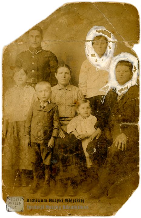 Stanisława Czyż Apolinarowna siedzi we środku - najmłodsza. Białe retusze służyły wyseparowaniu portretów do monideł (kolaży).