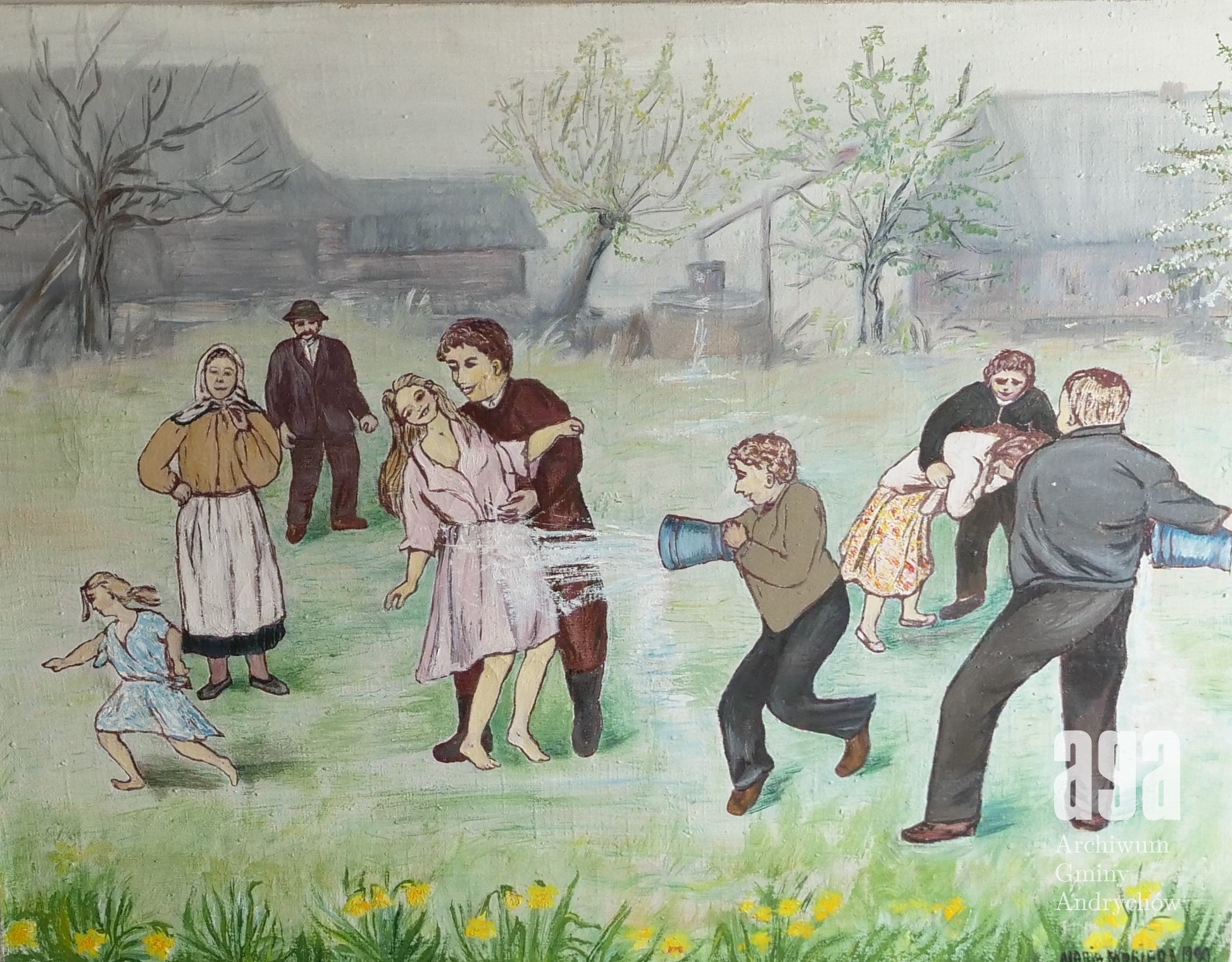 "A druga scenka z kolei to jest Śmigus Dyngus oczywiście związany z wielkanocą, dawniej każda dziewczyna musiała być polana wodą żeby miała szczęście bo jak jej nie polali w Śmigus Dyngus to nie wróżyło to dobrze dla niej no więc znowu, chodziła brygada chłopaków umówionych od domu do domu i polewali swoje koleżanki więc tutaj mamy tak: ten który polewa, z wiadra leje, to jest Piotrek Walczak, ten który trzyma dziewczynę żeby nie uciekła to jest nasz sołtys Staszek Prus, ten który tyłem stoi z wiadrem się zamierza to jest Stefek Mikołajko, a tam jest jeszcze Piotrek, drugą dziewczynę trzyma żeby mu nie uciekła, Piotrek Skowron. No oczywiście tu jest moja starsza siostra, natomiast ja jestem mała i U-cie-kam, tu jestem. Z tyłu tylko to młodzież jest współczesna, natomiast tam miała być babcia Antonina i dziadek Walusiak. Mówię miała wielki talent bo ona musiała pracować bardzo wyobraźnią plus jeszcze starać się żeby to przenieść na warsztat malarski, no dzisiaj to jest jedno kliknięcie i już mamy w kadrze zatrzymane, a tu musiała odświeżyć swoją pamięć i to jest scenka z domostwa z Roczyn, tam z tyłu jest mamy dom rodzinny, stodoła i zabudowania i studnia".