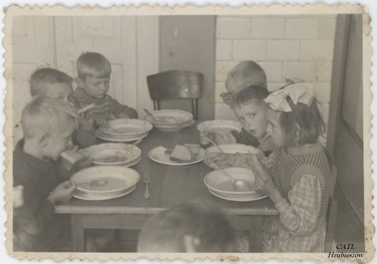 Dzieci w przedszkolu jedzą obiad, wśród nich Andrzej Jaworski. Przedszkole znajdowało się w nieistniejącym obecnie budynku nad rzeką Huczwą, wejście od strony 3-go Maja, w pobliżu dworku Du Chateau.