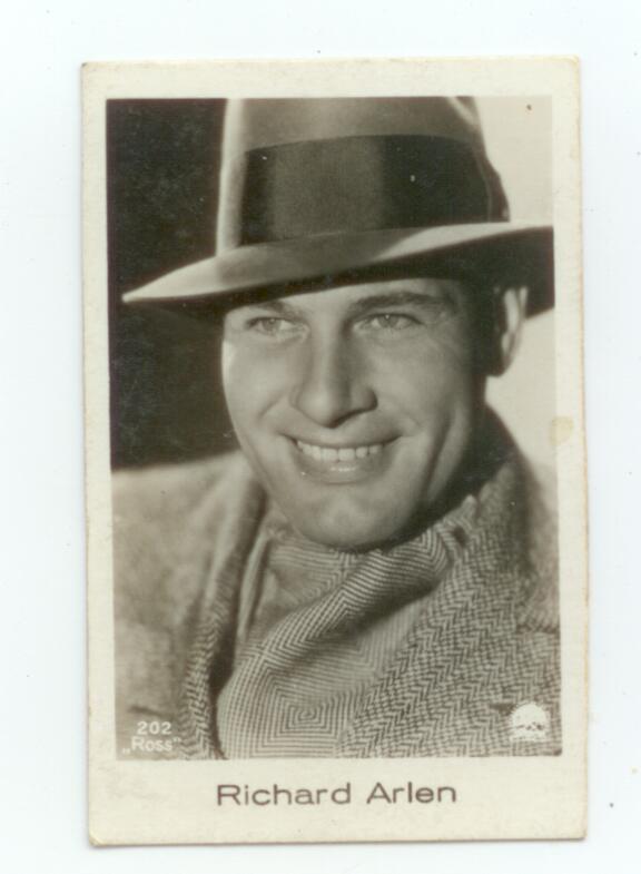 Fotos przedstawiający aktora Richarda Arlena. W latach 30-tych miniaturkowe zdjęcia ówczesnych gwiazd ekranu dołączone były do każdej tabliczki czekolady "Kinowej" tworząc kolekcję. Na odwrocie napis: "Gwiazdy ekranu olśniewają urodą i talentem. Czekolada Wedla budzi zachwyt nieporównaną delikatnością i subtelnością smaku". Fotosy udostępnił Janusz Jędrzejewski.