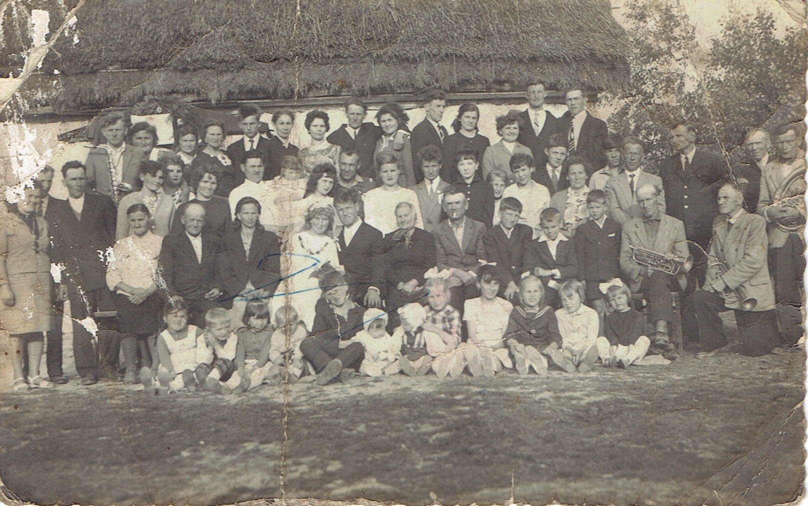 I rząd, od lewej: NN, Olejnik Jan (ociec Pani Młodej - były wójt Gminy), p. Piasecka – Mama Pana Młodego, Teresa Olejnik - Panna Młoda, Eugeniusz Piasecki (Pan Młody), p. Olejnik _mama Pani Młodej), ojciec Pana Młodego, Brat Pana Młodego, Adam Mendrzycki, Roman Kurowski, NN, Władysław Jarmużewski (muzykant- klęczy)