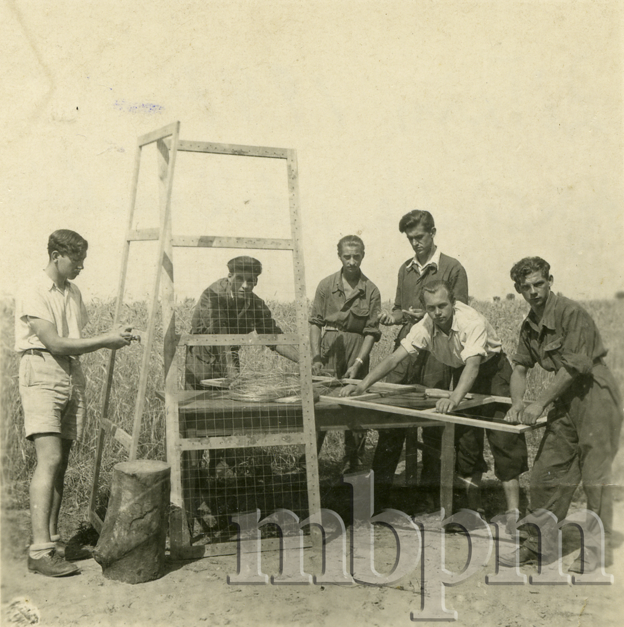 Liceum Jedwabnicze w Milanówku – prace techniczne związane z budową stojaków dla jedwabników (W podpisie na rewersie: Żółwin1947 stojaki dla jedwabników O. Włodarczyk, T. Wójcicki, J. Wójcick,i J. Zubowicz, J. Czymik, Z. Łotocki)