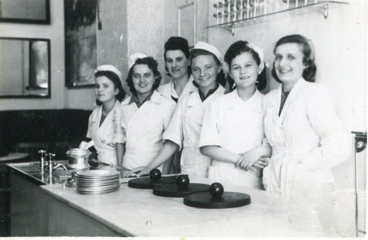 Pracownicy Lodziarni Maksa Kravca w Krakowie. Pierwsza z lewej Wanda Urlata - babcia udostępniającego fotografię Tomasza Piszczka (ze Stowarzyszenia "Nasze Psary"). Właściciel pochodził z północnych Włoch, a w Krakowie pojawił sie jeszcze przed wojną. Posiadał on wytwórnie lodów produkującą z włoskich półfabrykatów firmy "Luigi Olivo". Siedziba firmy Maksa Kravca mieściła się w Krakowie przy ul. Czystej. Znajdowało się tam również biuro, magazyny, sortownia i mała stołówka dla pracowników. Poza tym Włoch dysponował jeszcze ekskluzywnymi lodziarniami przy ul. Basztowej, ul. Wolskiej, ul. Starowiślnej i ul. Floriańskiej. Lodziarnie Maksa w czasie okupacji były "Nur fir deutche", co oznaczało, że klientami mogli być wyłącznie Niemcy, folksdojcze i młodzież z Hitlerjugend. Zaplecze lodziarni przy ul. Basztowej często jednak odwiedzali partyzanci. Niemieccy klienci oczywiście nie wiedzieli, że w tym samym czasie na zapleczu szatni przesiadywali konspiratorzy, którzy dostawali się tam niepostrzeżenie przez inną kamienicę, która graniczyła z lodziarnią przy ul. Basztowej. Nieznane Niemcom wejście wiodło od strony Starego Kleparza. Gdy w lodziarni pojawiała sie kontrola ulatniali sie tą sama droga ostrzegani przez szatniarza. Wanda Urlata pracowała w przedsiębiorstwie Włocha od 1942 do 1947 roku, w lodziarniach przy ul. Basztowej, ul. Wolskiej i ul. Czystej.Opracowane na podstawie artykułu Tomasza Piszczka zamieszczonego w Internecie pod adresem: http://www.geneis.pl/opowiesci-z-kamienicy/69-historia-pewnej-lodziarni