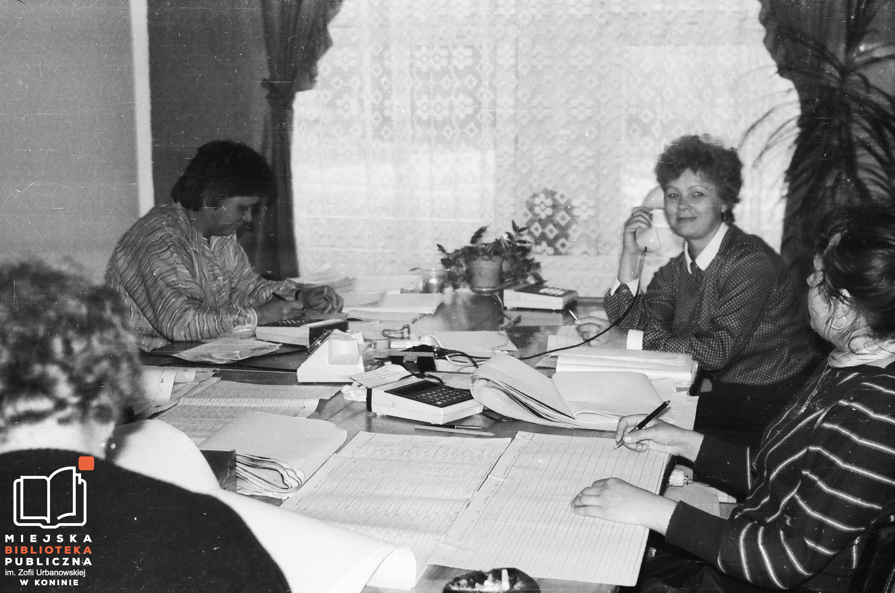 Na fotografii widzimy cztery osoby siedzące przy dużym biurku, pełnym dokumentów i narzędzi biurowych. Zdjęcie jest czarno-białe, co sugeruje, że pochodzi z lat 80. lub wcześniejszych.