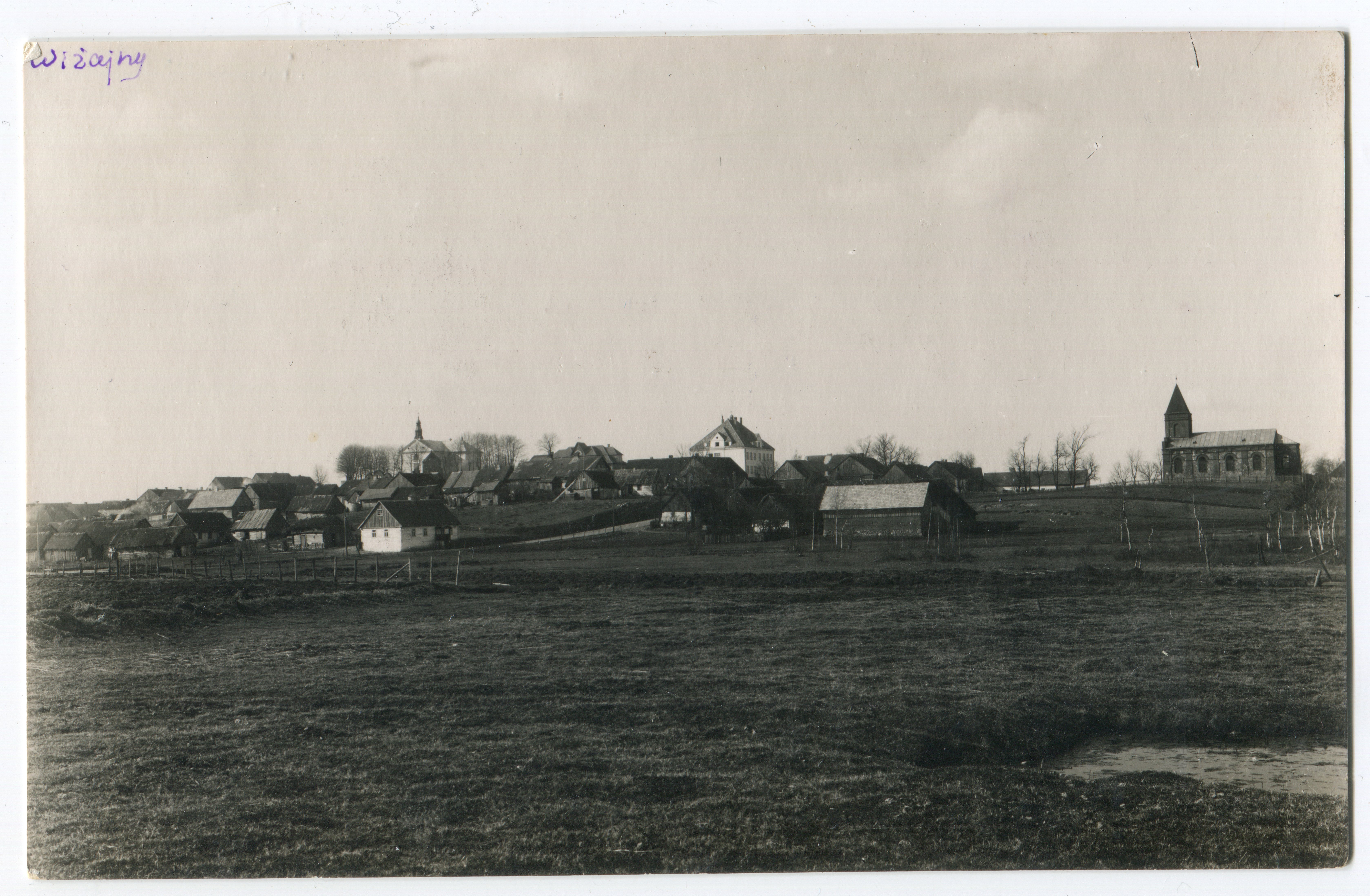 Co przedstawia ten materiał?Unikatowe zdjęcie drewnianej zabudowy Wiżajn, najprawdopodobniej z lat 30. Po prawej wyraźnie widoczna Kircha, czyli kościół ewangelicki, na środku góruje szkoła powszechna, za nią dach domu ludowego i po lewej, jeszcze w młodych drzewach kościół katolicki. Widok od strony bagien, widoczna część ulicy Sejneńskiej. Zdjęcie ze zbiorów Marcina Turkowskiego.