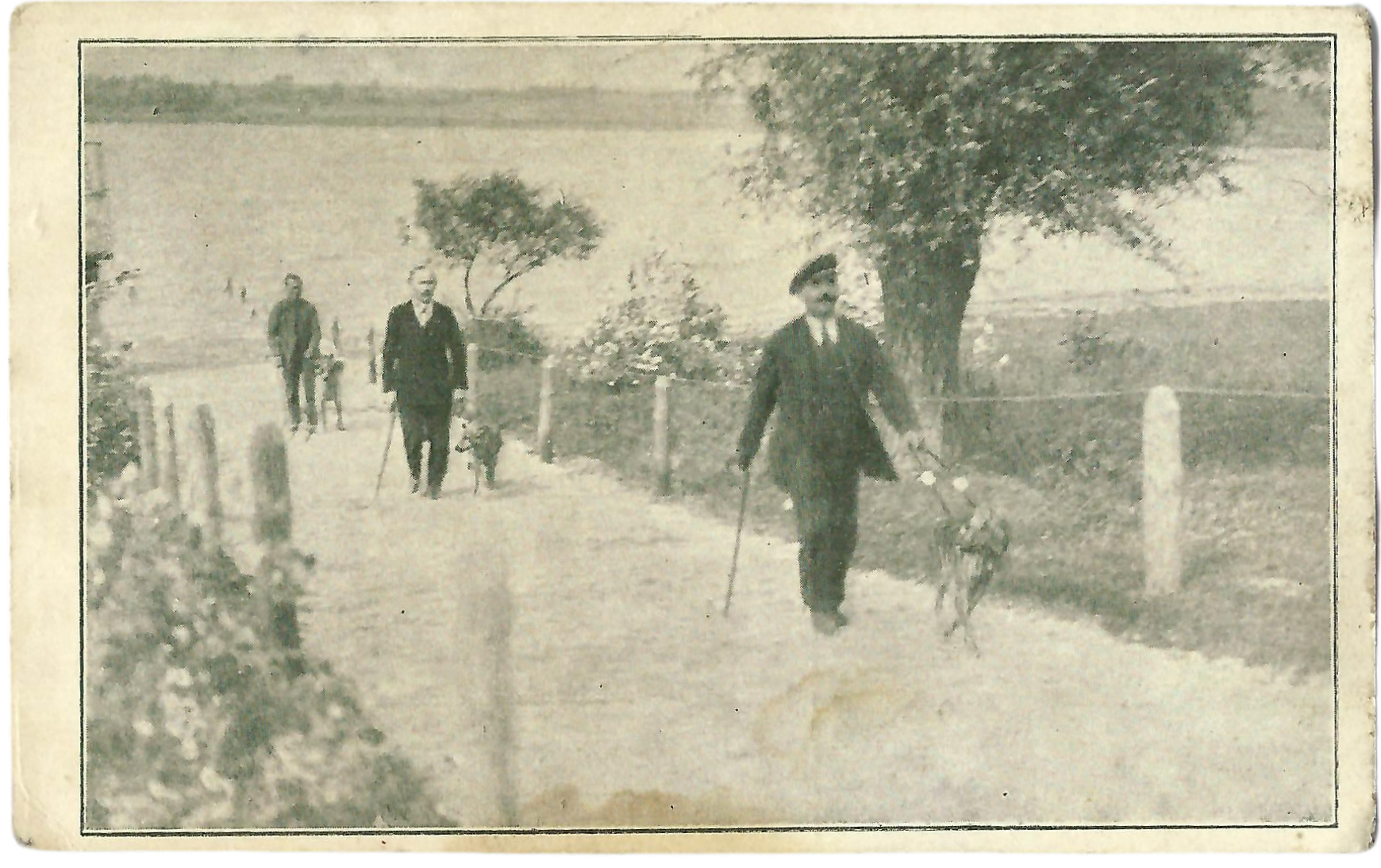 Trzy psy idą obok niewidomych weteranów wspartych o laski. Pierwsze dwa psy to owczarki niemieckie. Trzeci prawdopodobnie jest bernardyn. Grupa idzie piaszczystą ścieżką od strony jeziora w Ziemnicach Nowych w powiecie Kościan. Zdjęcie zostało wykonane w czasie Letniska Ociemniałych Żołnierzy.