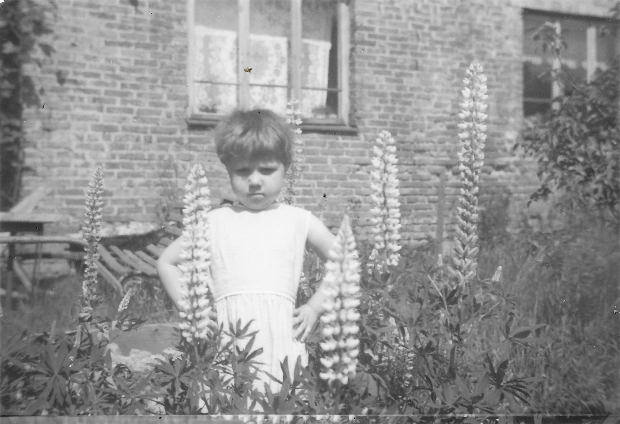 In the photo taken by my dad Józef Kropiewnicki, I am standing in the garden in front of the house. This photo evokes fond memories in me. I heard a little bit about the history of the house from my mother. It was built before the war by my uncle Stefan Grabowski, a very talented carpenter and bricklayer, with the help of his brothers. The house was built economically, with a mono-pitched roof and a blind wall glued to the neighbor. It was small and modest, it had two rooms, but wonderful windows. Adults said that these were Venetian windows. Maybe they were considered elegant at the time? The furniture inside was exceptionally beautiful: artisanal art deco, chest of drawers, dressing table, armchairs, chairs and a table with a beautiful veneer. All produced by my uncle! The plot has left room for a much better home in a richer future.