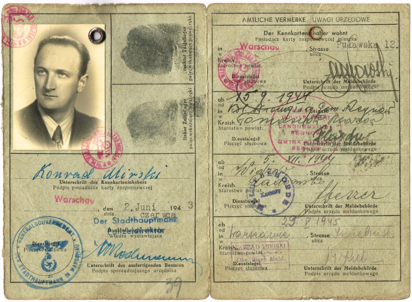 What does this material present?A false Kennkarte (identification card) of Tadeusz Jaworski, issued in the name of Konrad Mirski. Date of issue - 2 June 1943. Includes photo, fingerprints, registered addresses.
